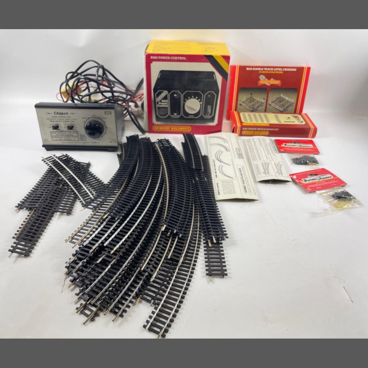 A boxed, as new, HORNBY RAILWAYS 00 GAUGE SCALE MODEL, Double track level crossing (R636), hand-operated curved points, boxed track pack B siding set (R361), 18 pieces of long curved track, 4 pieces of short curved track, 3 pieces of long straight track, a 20T Steel Mineral Wagon 'Blaenavon' (cat no 37437), 2 unopened packs of track fixing pins, a Hornby railways boxed R900 power control and a CLIPPER power control unit