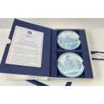also TWO boxed SARAH Wedgwood lidded Fine Bone China pin dishes unused items in original presentation boxes - dimensions 8cm diameter x 4cm depth and lastly an original presentation boxed Life And Works of Josiah Wedgewood miniature plate Collection to include two plates with scenes of 'Churchyard House And Works and also 'Ivy House Works' diameter of each 10cm diameter.