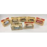 A collection of LLEDO MODELS of DAYS GONE to include a 1928 Tizer Model T Ford delivery van, 1934 Godfrey Davis Model A Ford woody wagon, a 1932 AEC regal London Transport single deck bus, a 1936 Packard Red Cross ambulance, a 1934 Great Western Railway single deck coach, a Mother's Pride van and a 1920 Model T Ford van for Barclay's bank, all boxed in original condition