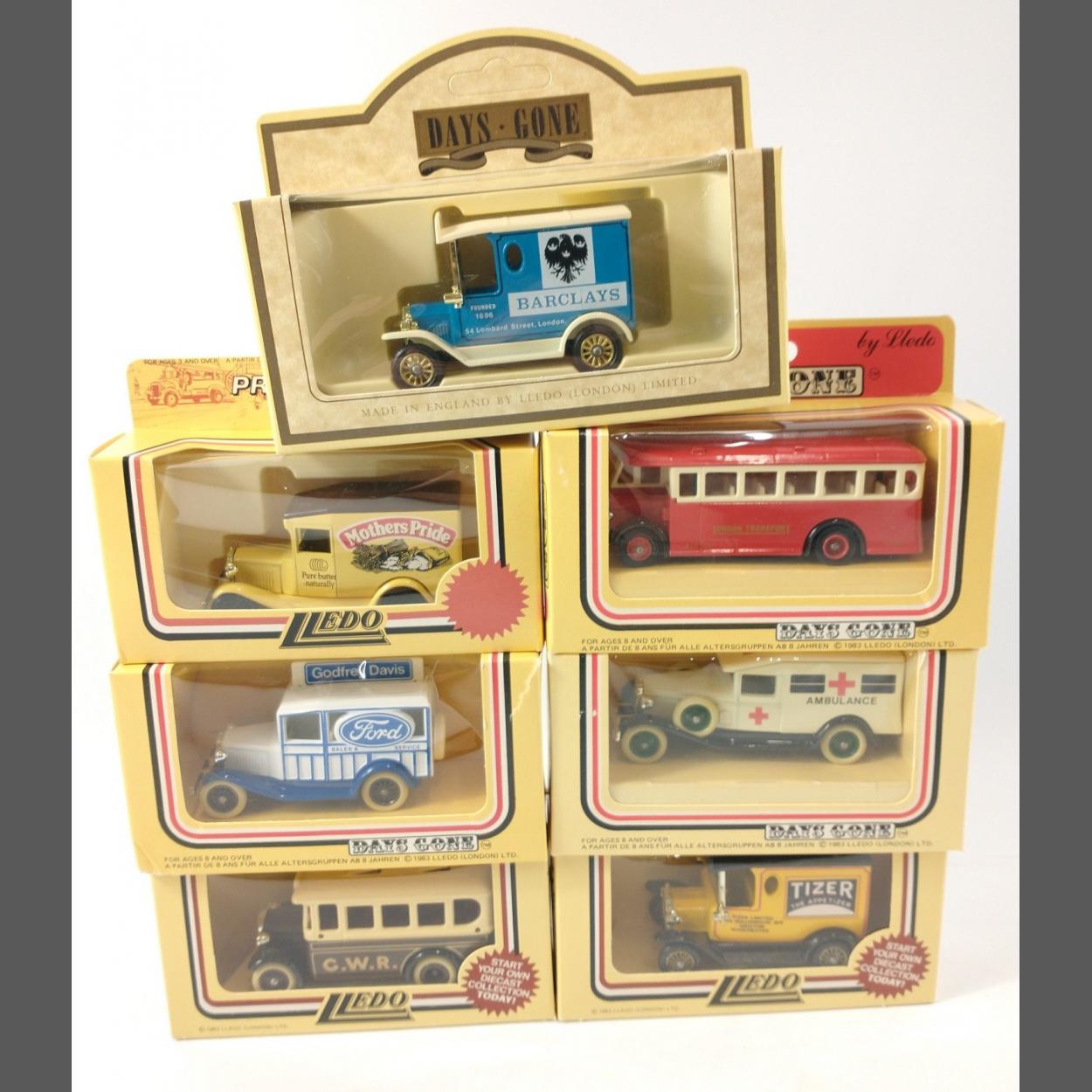 A collection of LLEDO MODELS of DAYS GONE to include a 1928 Tizer Model T Ford delivery van, 1934 Godfrey Davis Model A Ford woody wagon, a 1932 AEC regal London Transport single deck bus, a 1936 Packard Red Cross ambulance, a 1934 Great Western Railway single deck coach, a Mother's Pride van and a 1920 Model T Ford van for Barclay's bank, all boxed in original condition