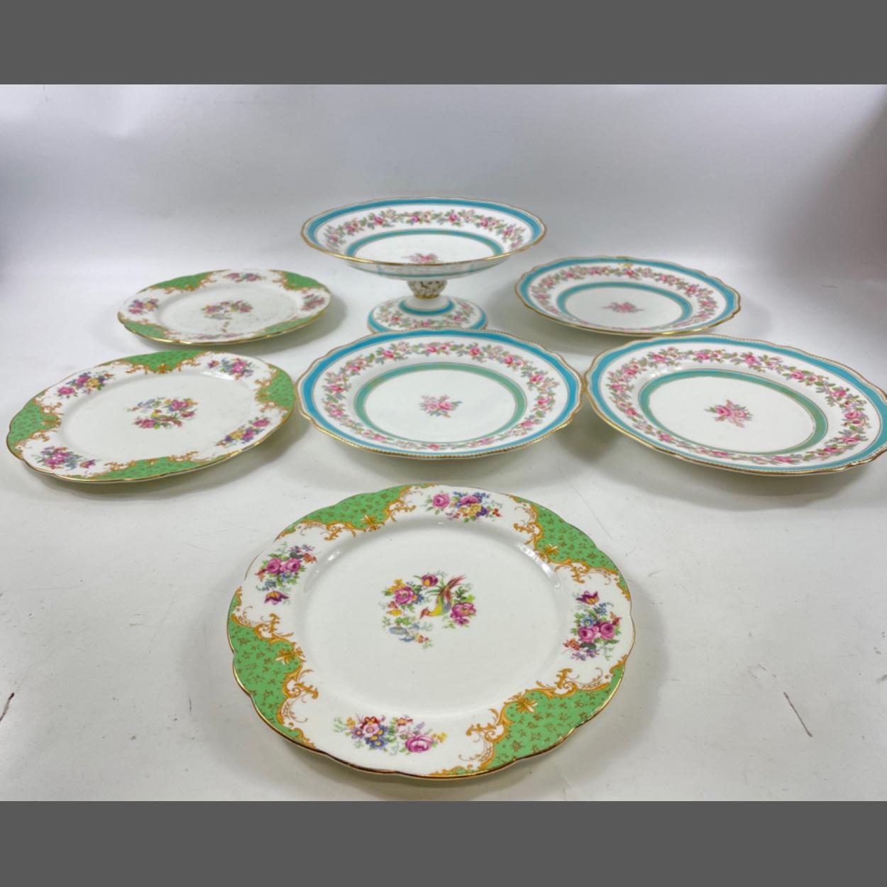 VINTAGE - Three COPELAND plates diameter 23cm and a matching tazza 10cm tall, with pattern in blue rings with pink roses first registered in August 1852, plus 3 PARAGON ROCKINGHAM plates (21cm dia),