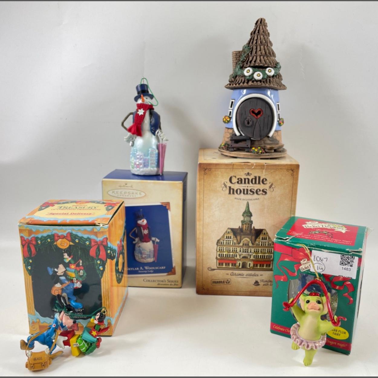 A Collection of (All in Original boxes) Xmas decorations to include a Candle House, A Hallmark snowman, A Special Delivery Disney style Xmas ornament and a SUGAR PLUM FAIRY