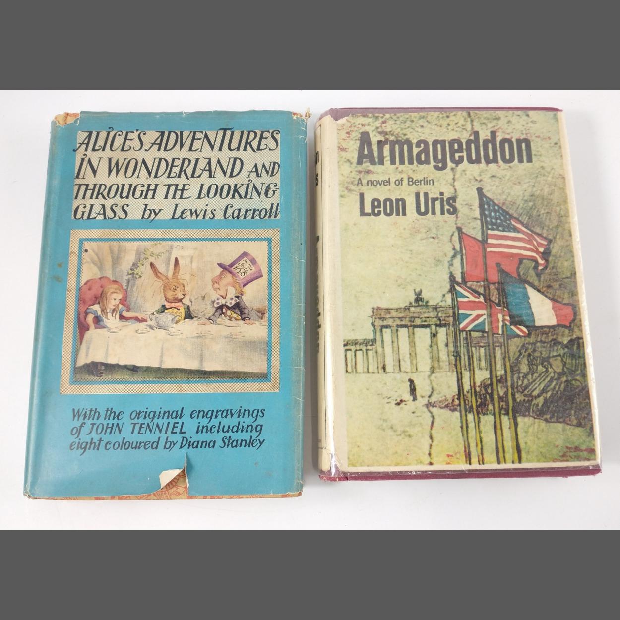 A first edition hardback copy of ARMAGEDDON by LEON URIS published 1964 and the genius of Lewis Carroll in the combined ALICE'S ADVENTURES IN WONDERLAND and THROUGH THE LOOKING GLASS with the original engravings of JOHN TENNEL including eight coloured by DIANA STANLEY, Children's Illustrated Classics edition published 1954, some wear to dust jacket, overall in good condition