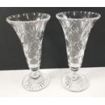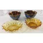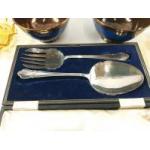 A mixed lot to include 2 copper lustre vases (12.5cm dia, 7cm high), 3 pressed glass tazzas - would look lovely as a dining table centrepiece ( tallest 16cm high, dia 15cm), 2 crystal flower vases (20cm tall), 2 pressed glass trinket dishes (16cm and 13cm) and a presentation box of EPNS salad servers (22cm long)