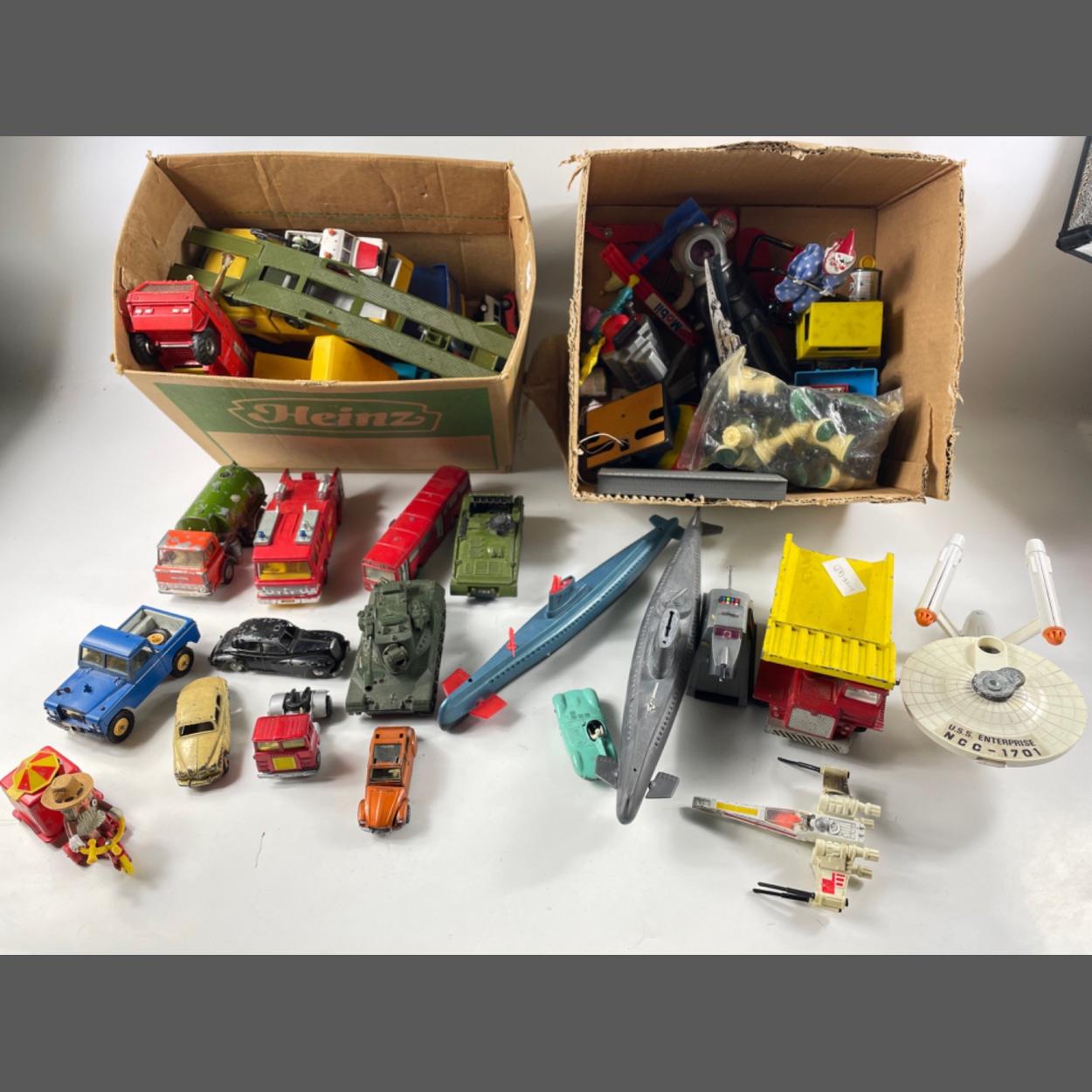 Collection of play-worn Dinky Toys in two boxes to include The Star Ship Enterprise, Leopard Tank, etc