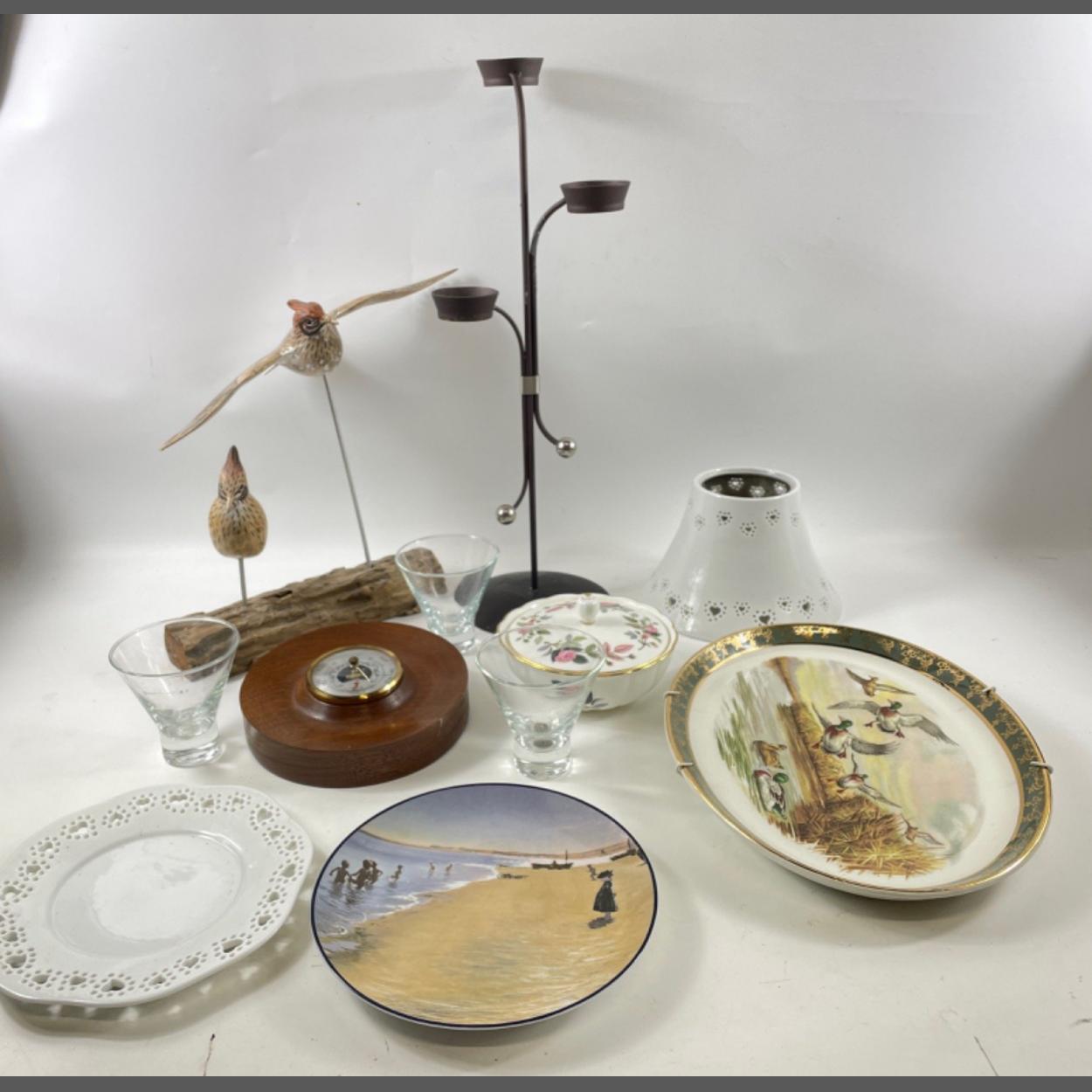 A tea-light candle shade and saucer, an old wall circular barometer, a birds ornament etc