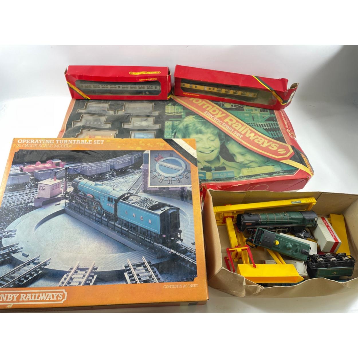 For the train enthusiast nothing but the best - HORNBY to include an Inter-City M5120 carriage, a GWR 5104 carriage and guard's van, a partial boxed Electric Train Set, an Operating Turntable Set, a GWR loco 8751 and tender, a Britannia 70000 engine,