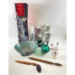 A LARGE MIXED BOX FILLED fabulous items to include Shish Kebab Skewars still in box, MINTON boxed Charles and Dianna Commemorative wedding 1884, two Famille Rose style ORIENTAL vases, a plated candleabra, a new boxed set of JASON Coasters and so much more!