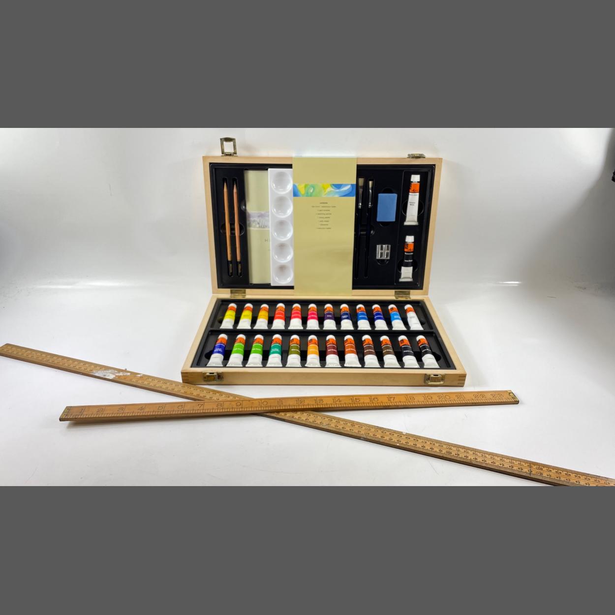 A Christmas gift for an artist - an unused WH SMITH large WATERCOLOUR ART BOX plus a wooden 100cm rule and a wooden 24 inch ruler