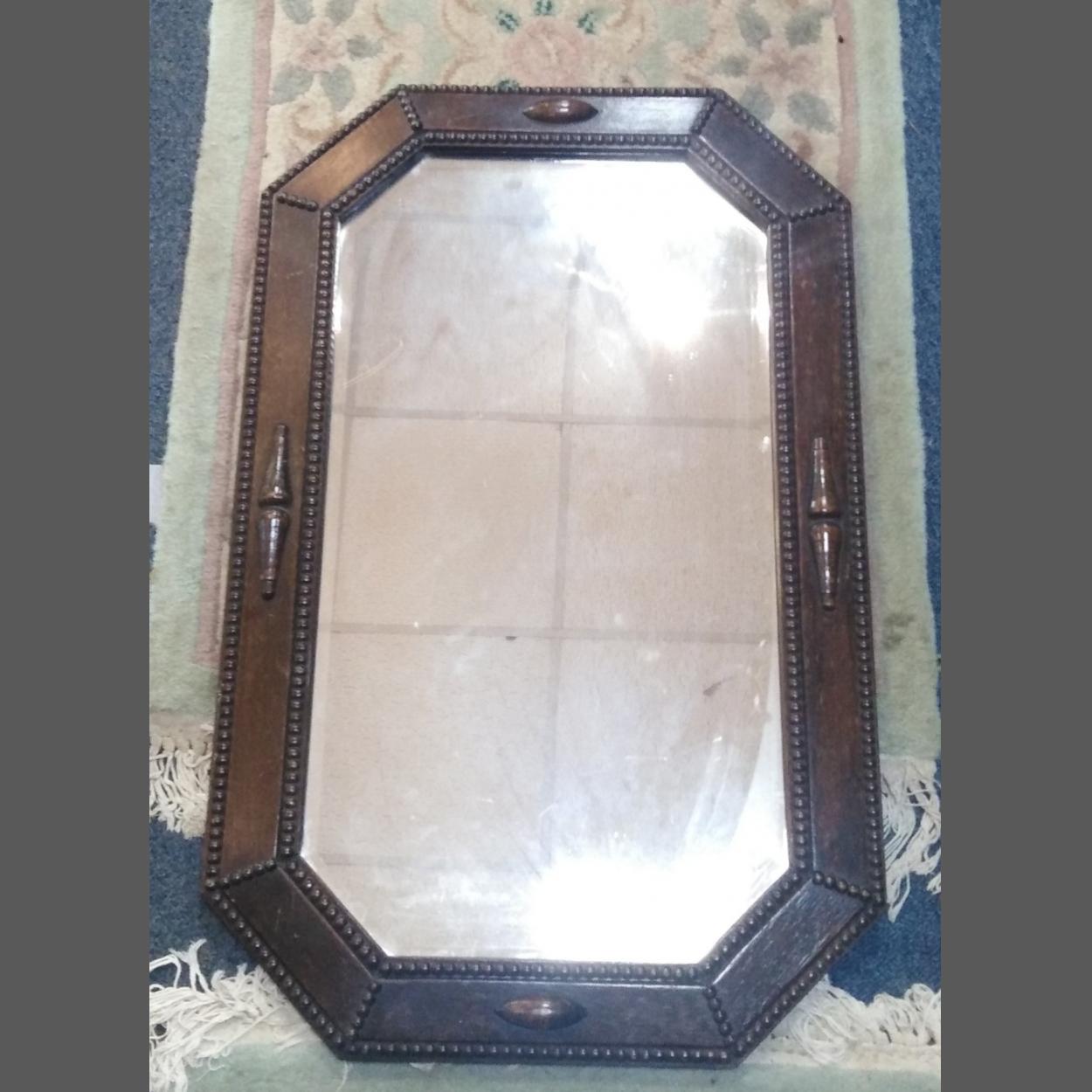 A SUBSTANTIAL EDWARDIAN beaded oak framed wall mirror with eight sides - dimensions length 80cm x width 53cm approx