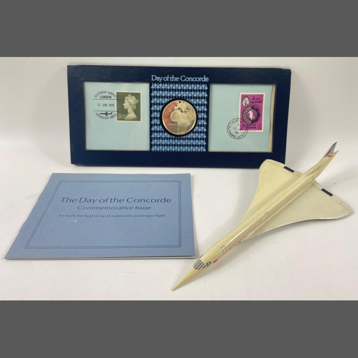 Mint coin DAY OF THE CONCORDE commemorating Concorde's inaugral flight from Heathrow to Bahrain on Jan 21st 1976, comes with mint stamps from UK and Bahrain and a model Concorde 25cm long