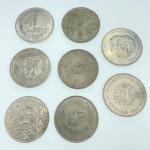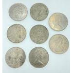 A selection of loose five pound coins to include a Millennium 1999/2000 coin, 1953-1993 commemorative coin, 1947-1972 silver anniversary coin, 1977 Silver Jubilee coin, a 1960 five shilling coin and 2 1981 Charles and Diana coins plus a boxed unopened 1983 one pound coin and one other that has been opened.