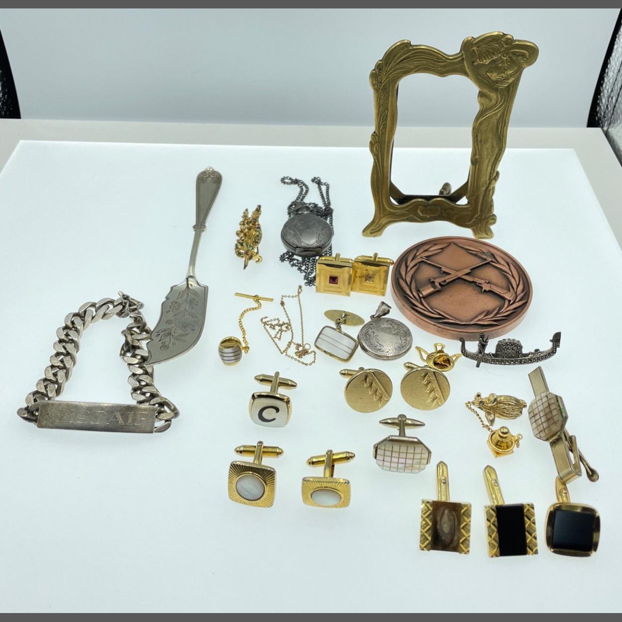 A mixed lot to include a Brazilian silver butter knife (15cm long), a man's white metal identity bracelet (20cm long) inscribed 'Alistair', a small box of cufflinks and tiepins, a ladies pocket watch on a chain (2.5cm dia), a locket pendant stamped 925, (2.5cm dia), a multi-stoned brooch, a brass Art Deco style picture frame (9x6cm) and a 1983 Rifle Team Winners medal