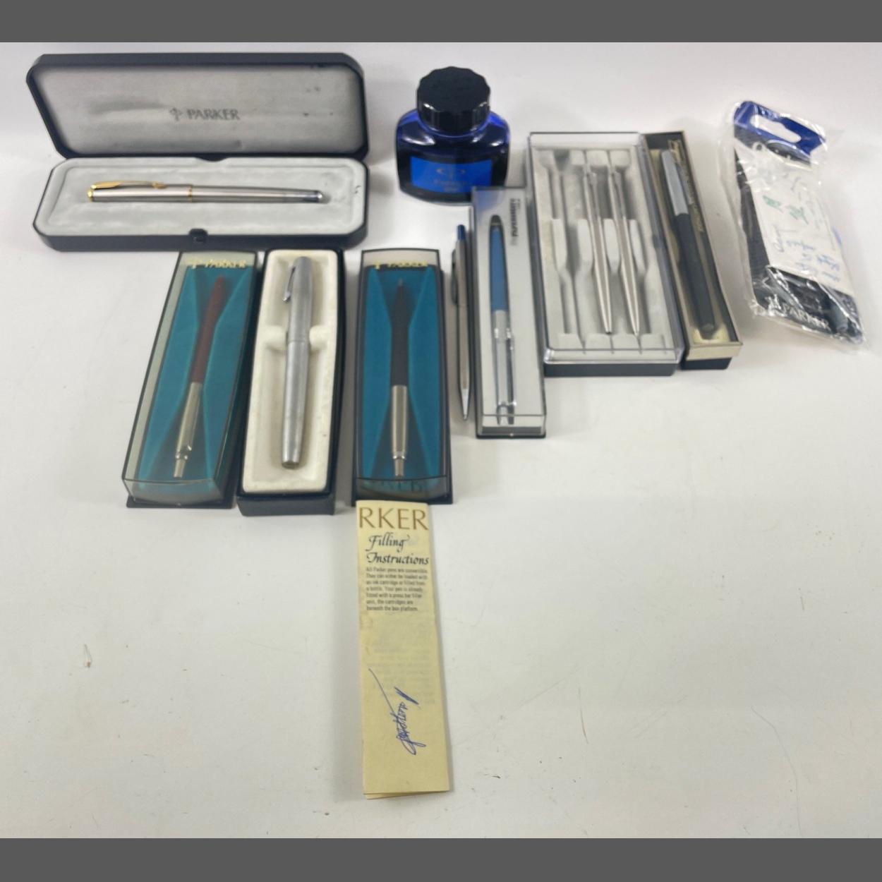 A collection of boxed pens to include PARKER ballpoint and fountain, CURBA, PLATIGNUM, SCHAEFFER and PAPERMATE plus a bottle of ink, 2 ink cartridges and replacement parker cartridges