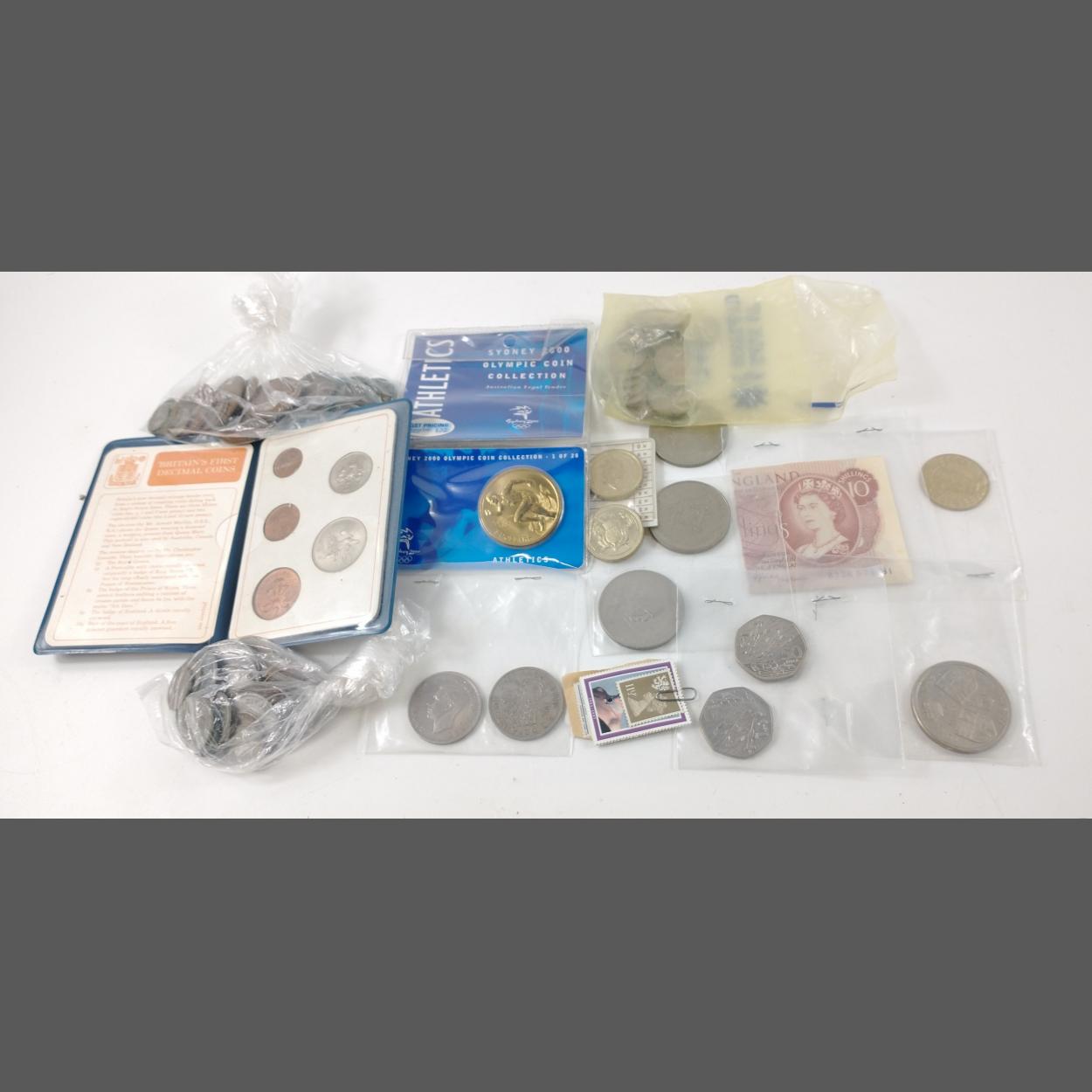 A mixed collection of coins to include a 10 shilling note, a 1993 50p piece commemorating D-Day, a golden wedding anniversary 5 pound coin for the Queen and Prince Philip, 2 x 2 pound coins from 1986 and 1995, a Churchill 1965 coin, a wallet containing Britain's first decimal coins, 2 bags of mixed coins, a bag of 5p and 1 shilling coins and a Sydney Olympics athletics coin, some UK stamps etc etc