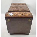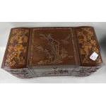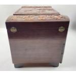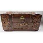 SUBSTANTIAL carved wooden jewellery box with traditional ORIENTAL scenes, with two drawers, and a butterfly style opening lid - dimensions height 21cm x width 42cm x depth 22cm approx - to include also a quantity of costume jewellery