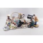 A mixed box of bric-a-brac to include ROYAL DOULTON 'The Clown' (HN2890) stands 23cm tall, missing part of one finger, plus ROYAL DOULTON 'The Master' (HN 2325) stands 16cm tall, missing part of crook, a LIMOGES trinket dish, 2 GRAFTON WARE demi-tasse cups and saucers, a cloisonne egg on a wooden stand,a HUMMEL school boy, a ROYAL DOULTON toy dog collection - PUG and much, much more