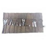 A wooden box full of vintage tools to include 3 saws, planes and a roll full of spanners