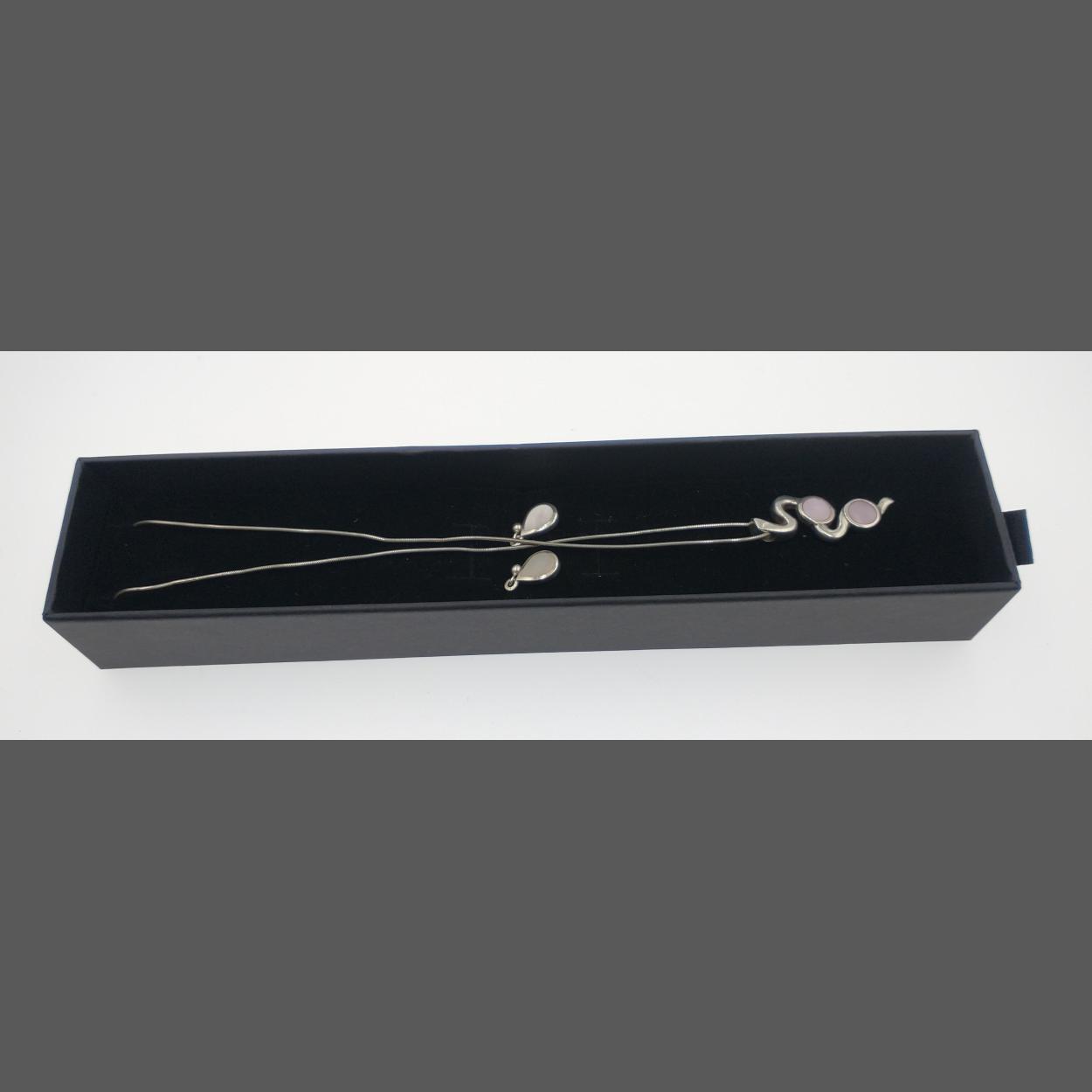 One necklace (46cm) stamped 925 with a drop pendant (3.5cm) stamped 925 with opalescent mother of pearl stones, also a matching pair of earrings (stamped 925), gross weight 10g