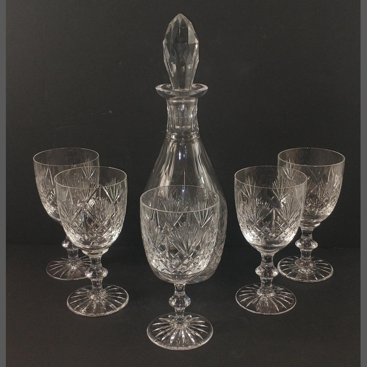 A top quality crystal decanter (32cm tall) and 5 wine goblets