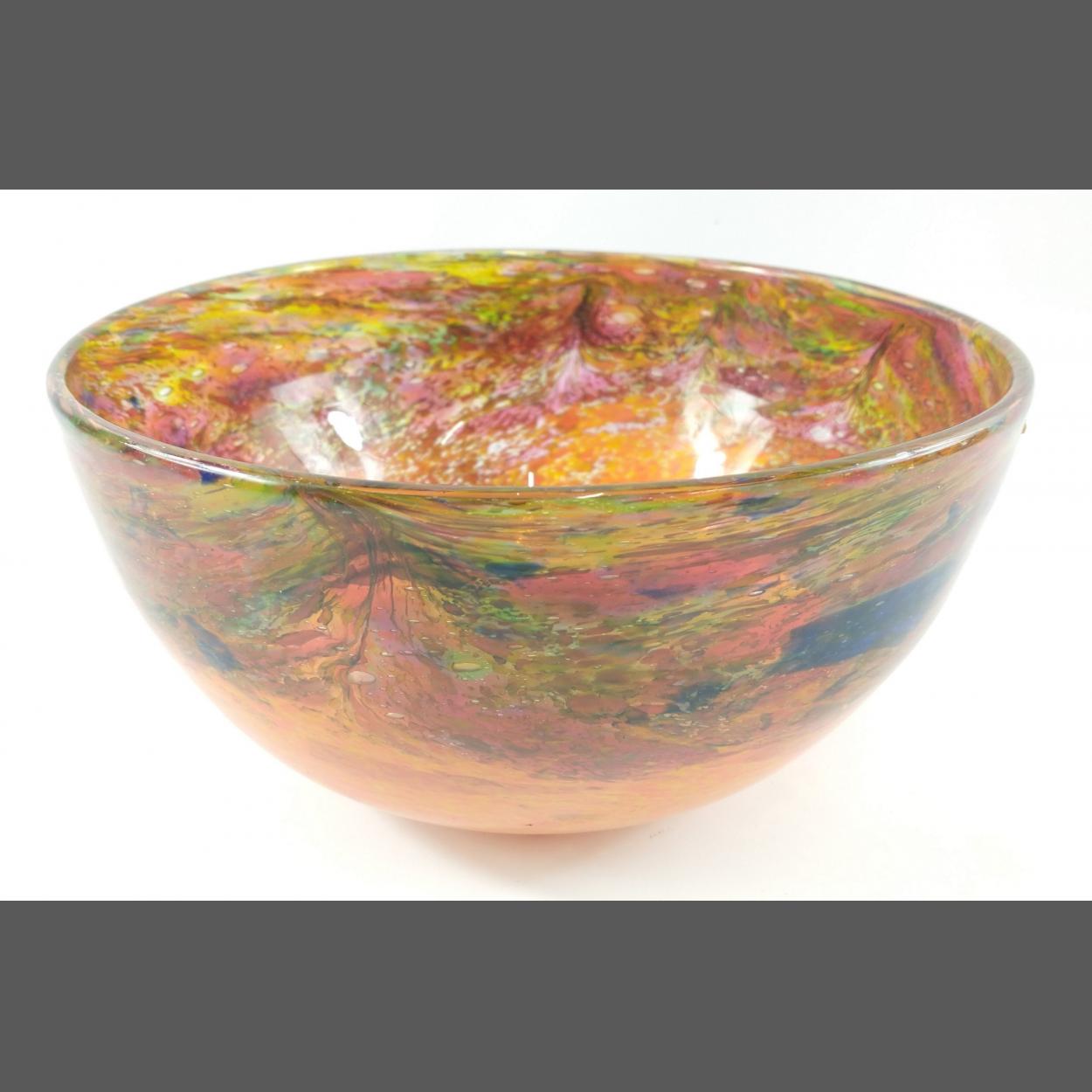 A BEAUTIFUL swirly orange based multicoloured coloured glass fruit bowl - dimensions 30cm diameter approx