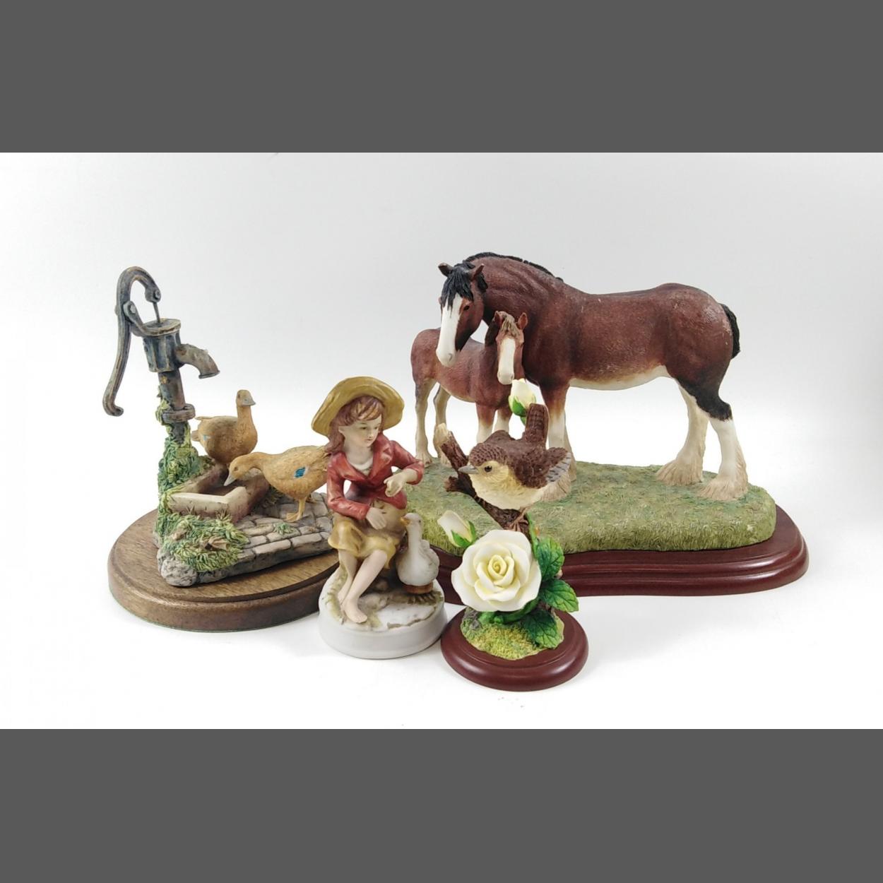 Collection of ornaments to include 3 BORDER FINE ARTS and one other. To include BFA A6053 'Wren' (H: 12cm approx), BFA JH45 'Thirsty Work' made in Scotland (H: 14cm approx) with stand, BFA A0187 'Clydesdale' made in China (H: 16cm approx) with attached stand and young boy feeding goose with indistinct blue mark to base (H: 13cm approx) old chip to hand.