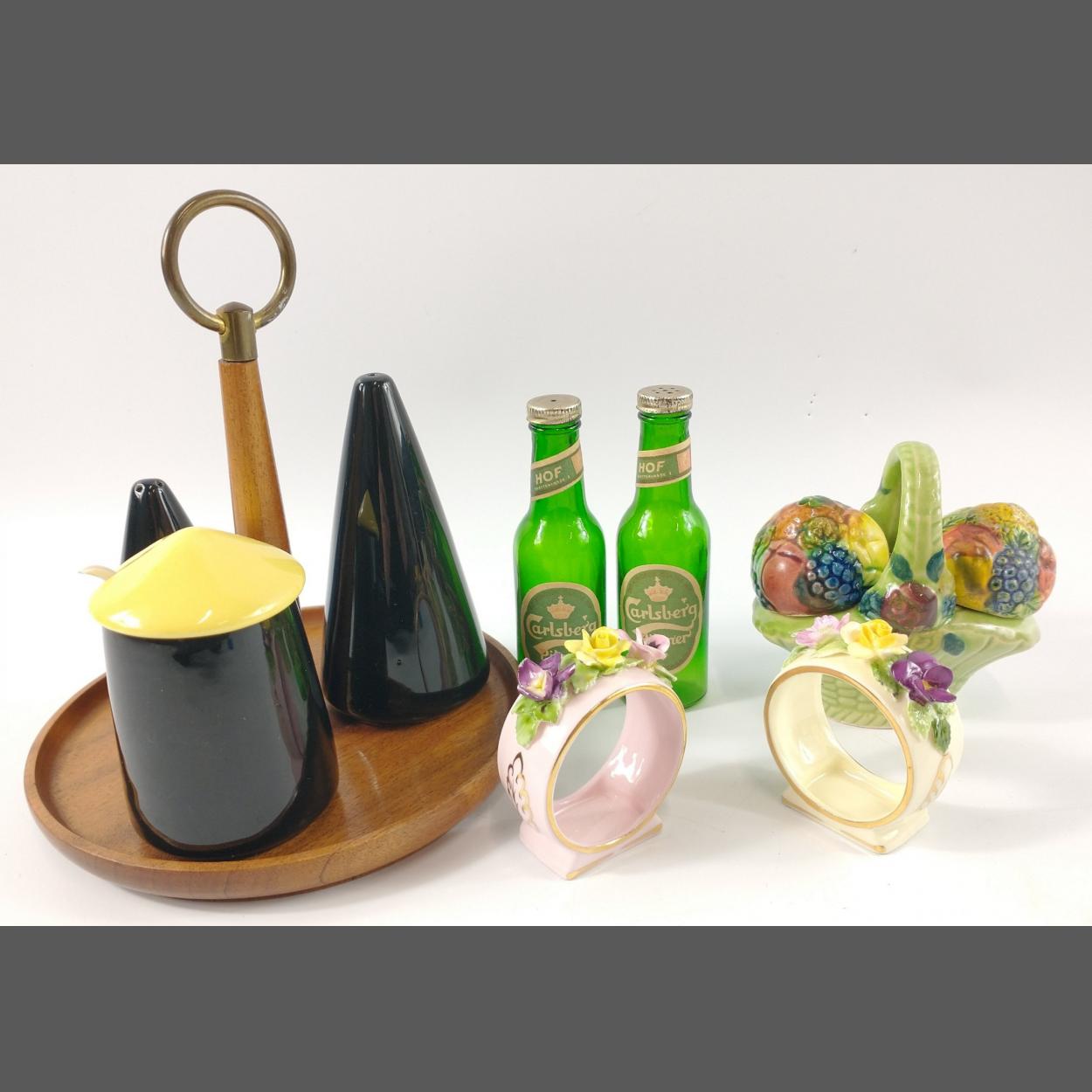 A retro Danish condiment set comprising salt, pepper and mustard dish (with spoon) on a wooden tray (approx 14cm dia), plus a further salt and pepper made from miniature Carlsberg bottle, 2 Adderley napkin rings (slight damage to 2 petals) and a made in Japan basket of fruit salt and pepper etc