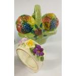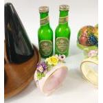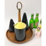 A retro Danish condiment set comprising salt, pepper and mustard dish (with spoon) on a wooden tray (approx 14cm dia), plus a further salt and pepper made from miniature Carlsberg bottle, 2 Adderley napkin rings (slight damage to 2 petals) and a made in Japan basket of fruit salt and pepper etc