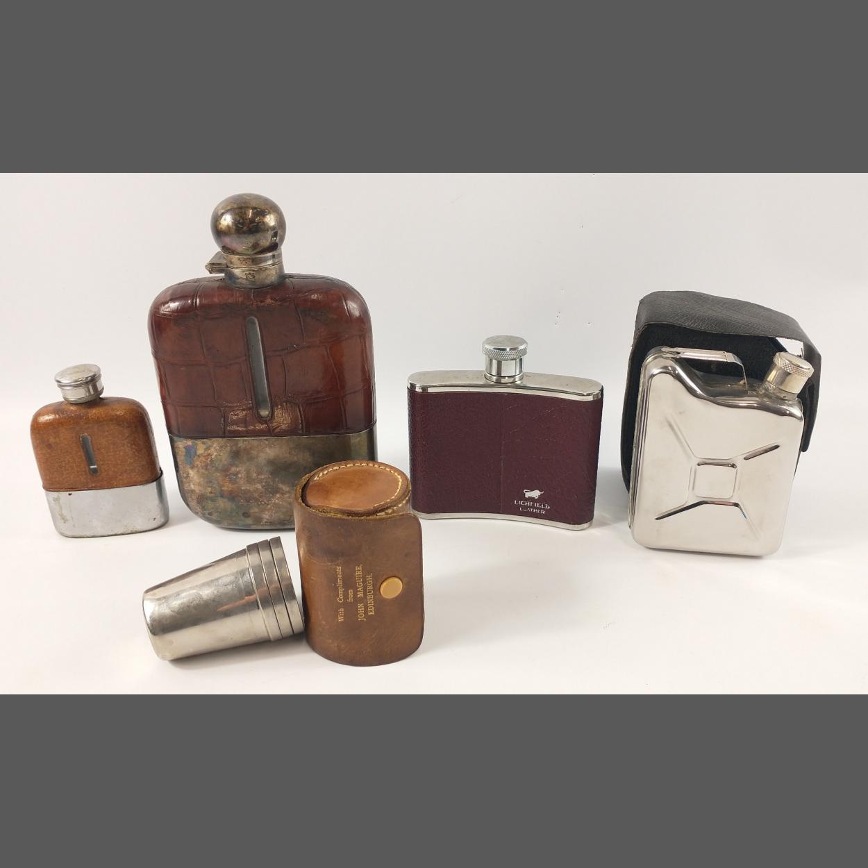 Collection of drinking memorabilia. To include two plated bottom glass hip flasks, one with alligator style (H: 17cm approx), other leather style. Also includes Lichfield leather curved hip flask (H: 10cm approx), unusual Jerry can style hip flask in leather case(H: 10cm approx) and set of 3 shot glasses in leather pouch from John Maguire, Edinburgh
