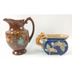 A nice example BURSLEM POTTERIES handpainted floral jug - dimensions 17cm height x 11cm wide approx, with also a classic MAJOLICA style novelty milk jug with a monkey form handle - dimensions 11cm high x 15cm length approx