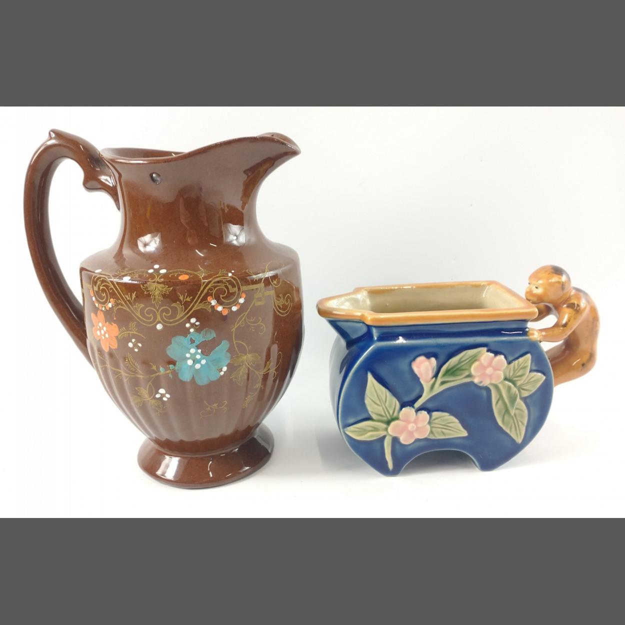A nice example BURSLEM POTTERIES handpainted floral jug - dimensions 17cm height x 11cm wide approx, with also a classic MAJOLICA style novelty milk jug with a monkey form handle - dimensions 11cm high x 15cm length approx