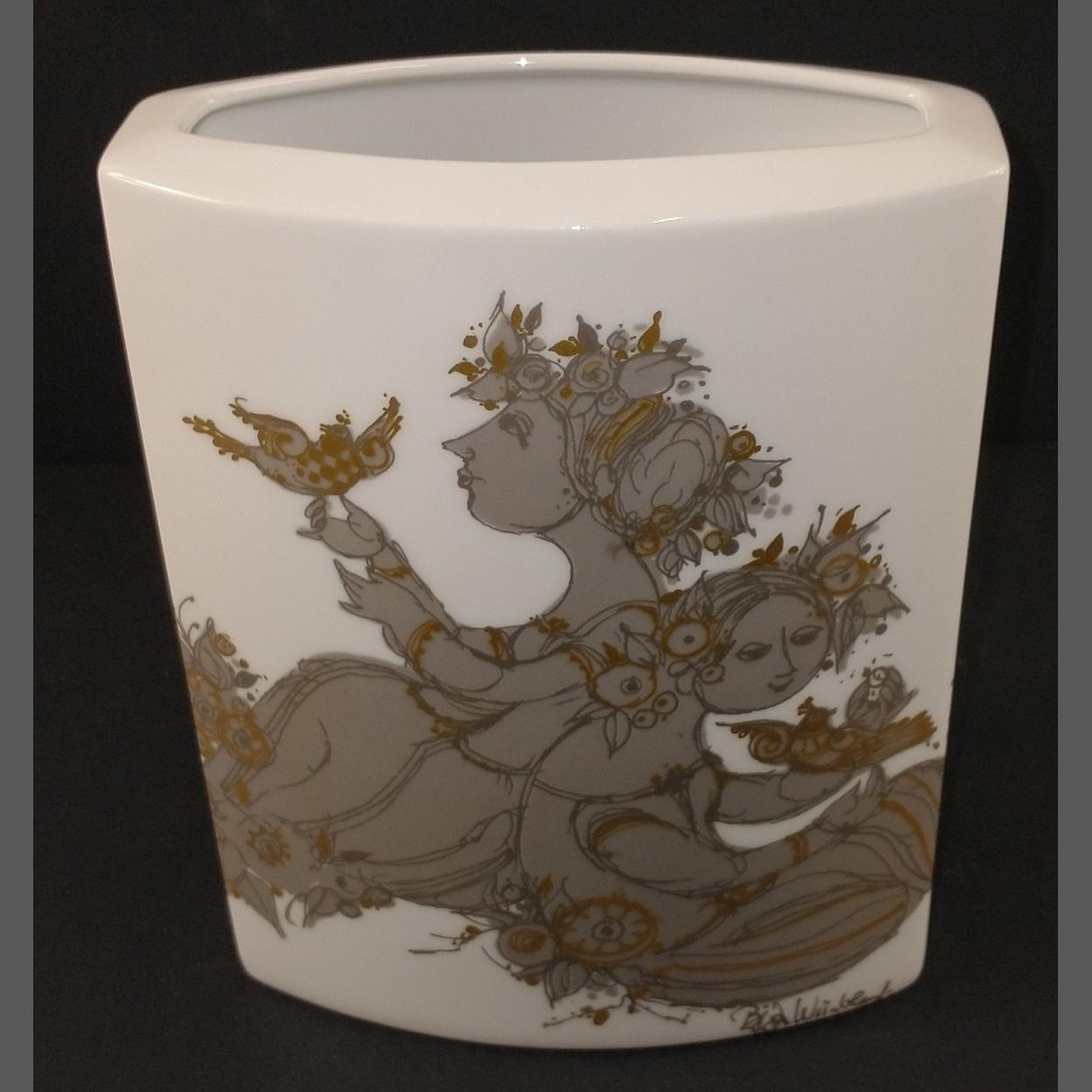 A collectable vintage ROSENTHAL vase signed by BJORN WIINBLAD with a grey and gilt design of 2 ladies stands 17cm high