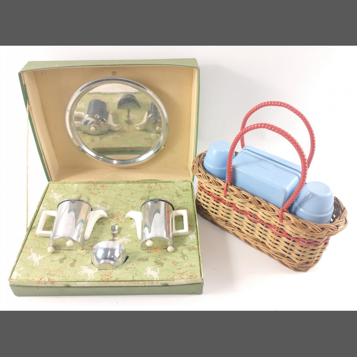 A KAVIN KUPID branded child's picnic teapot, water jug and sugar bowl set, with a VINTAGE childs picnic set in a basket