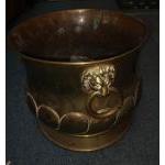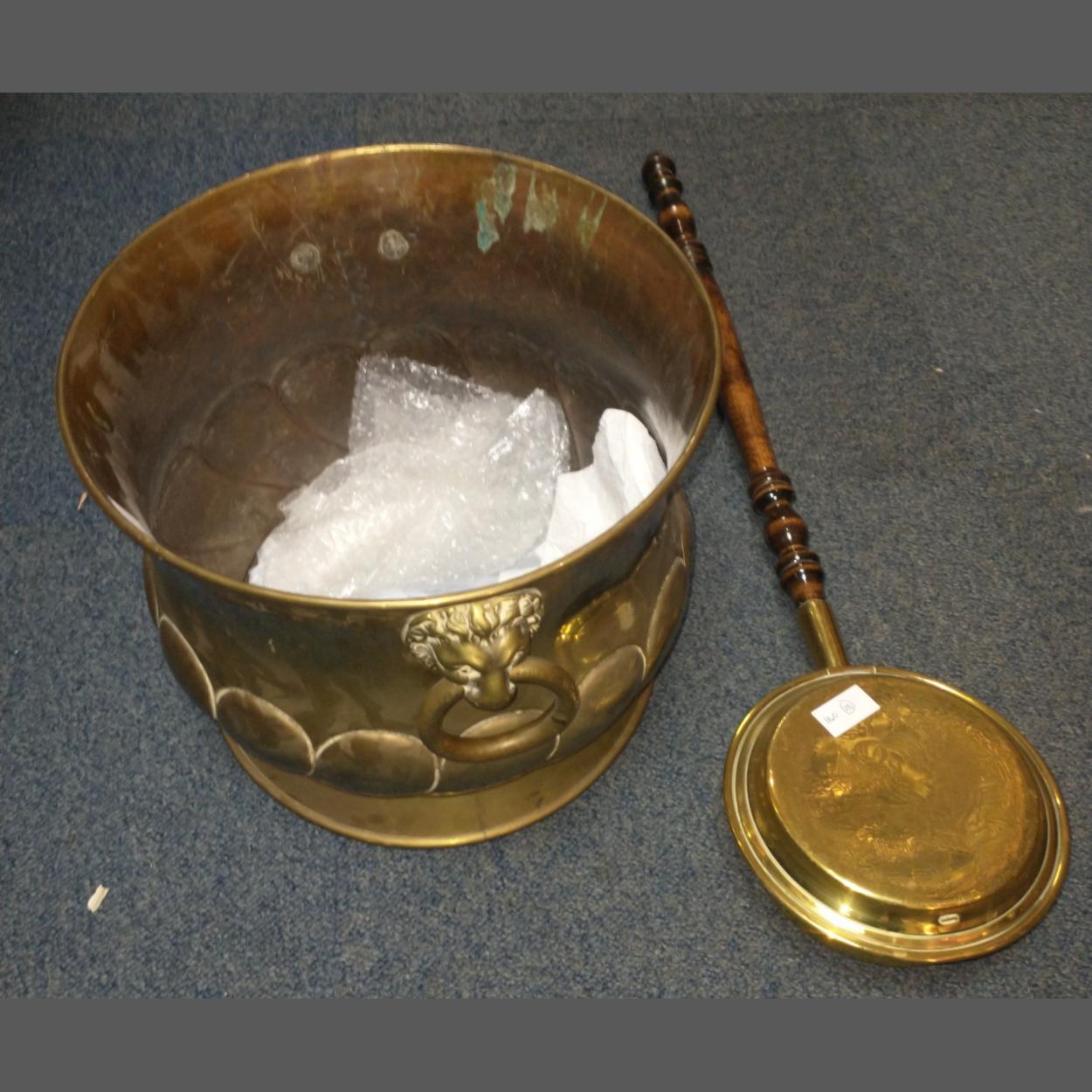 A LARGE solid brass planter with lion ring handles 34cm diameter x 18cm height - exceptional quality! with also a small brass bed pan