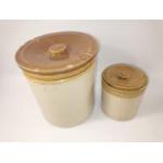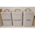 Kitchen storage both retro and modern - 3 sleek grey tins for coffee, sugar and tea (19cm high) plus 2 stoneware jars one for 5lbs and the other stamped Buchan, Portobello, Edinburgh for 20oz.