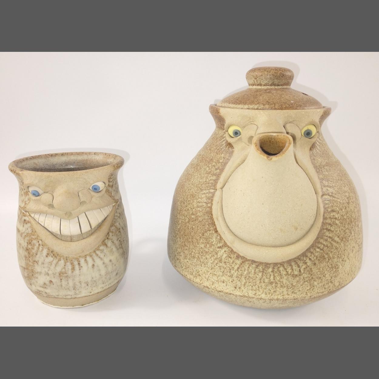 MUGGINS POTTERY - a large teapot (20cm tall) plus a toothy mug (11cm tall)