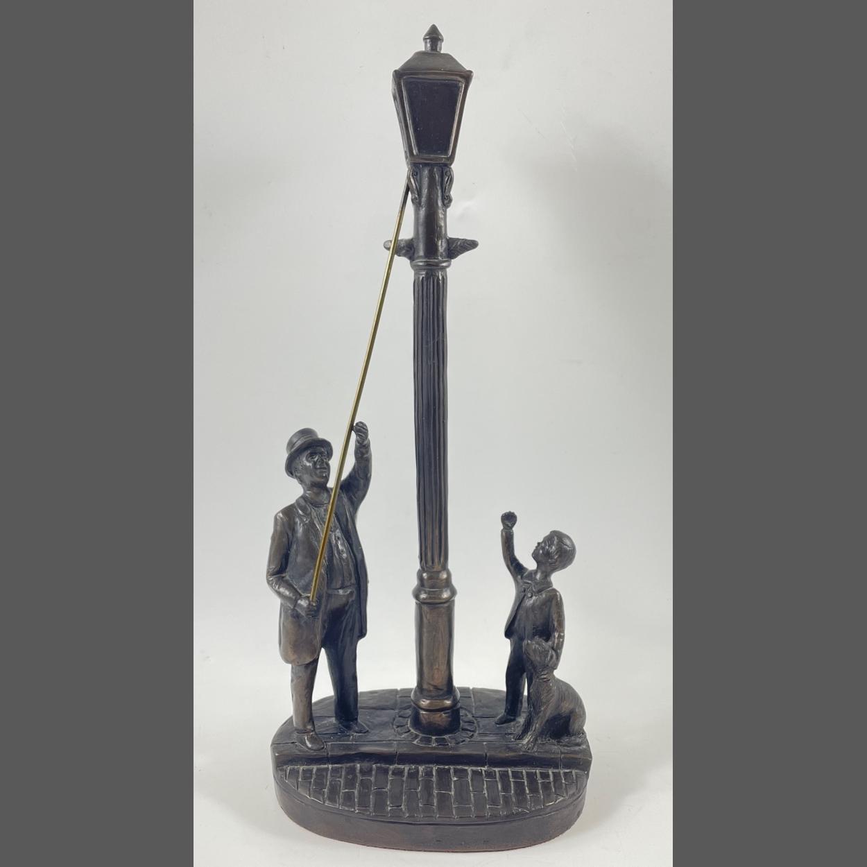 A vintage GENESIS (E/5000) fine arts bronze lamplighter with a boy and small dog stands 31cm tall