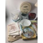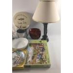 A mixed lot to include 'Miao-yu', plate 5 in the Beauties of the Red Mansion series, a white M&S bowl (23cm), a small aluminium watering can, a large cake tin (26cm dia, 10cm high), an ANITA HARRIS tulip vase (has some damage), 6 M&S champagne flutes, 8 cream fabric placemats, 4 teatowels, an unopened 500 piece jigsaw puzzle 'Topping Up' and a table lamp