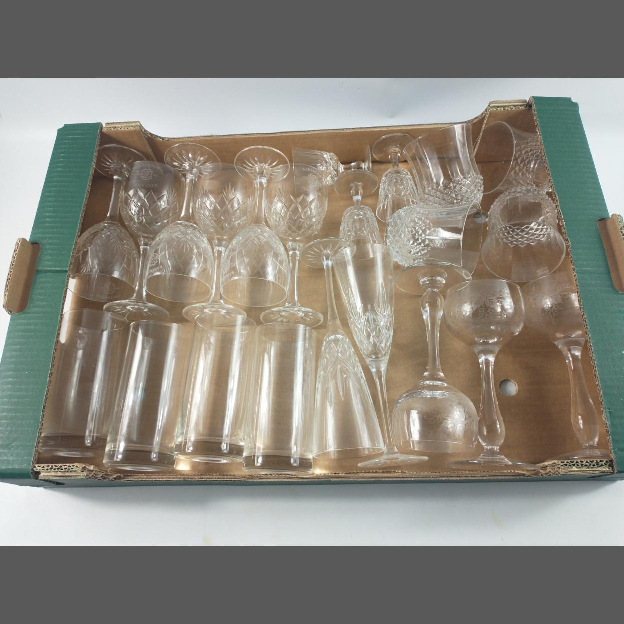 A box of mixed glassware to include 6 red wine glasses inscribed Baberton Golf Club, a pair of champagne flutes, 3 long-stemmed hock glasses inscribed with grapes and vines, 4 hi-ball glasses etc