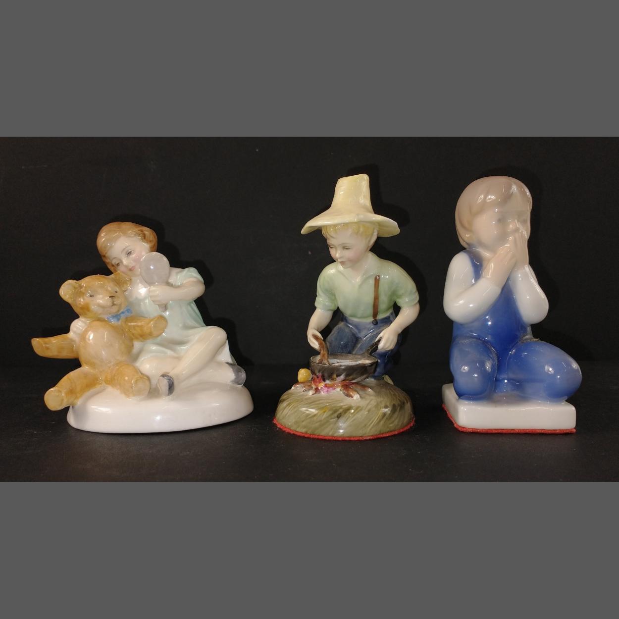 Three small figurines to include ROYAL DOULTON My Teddy (HN 2177) plus 2 boy figurines with covered-up maker's details, one a boy frying a fish on an open fire (11cm), possibly Royal Doulton "River Boy" HN2128 the other a boy kneeling (10cm)