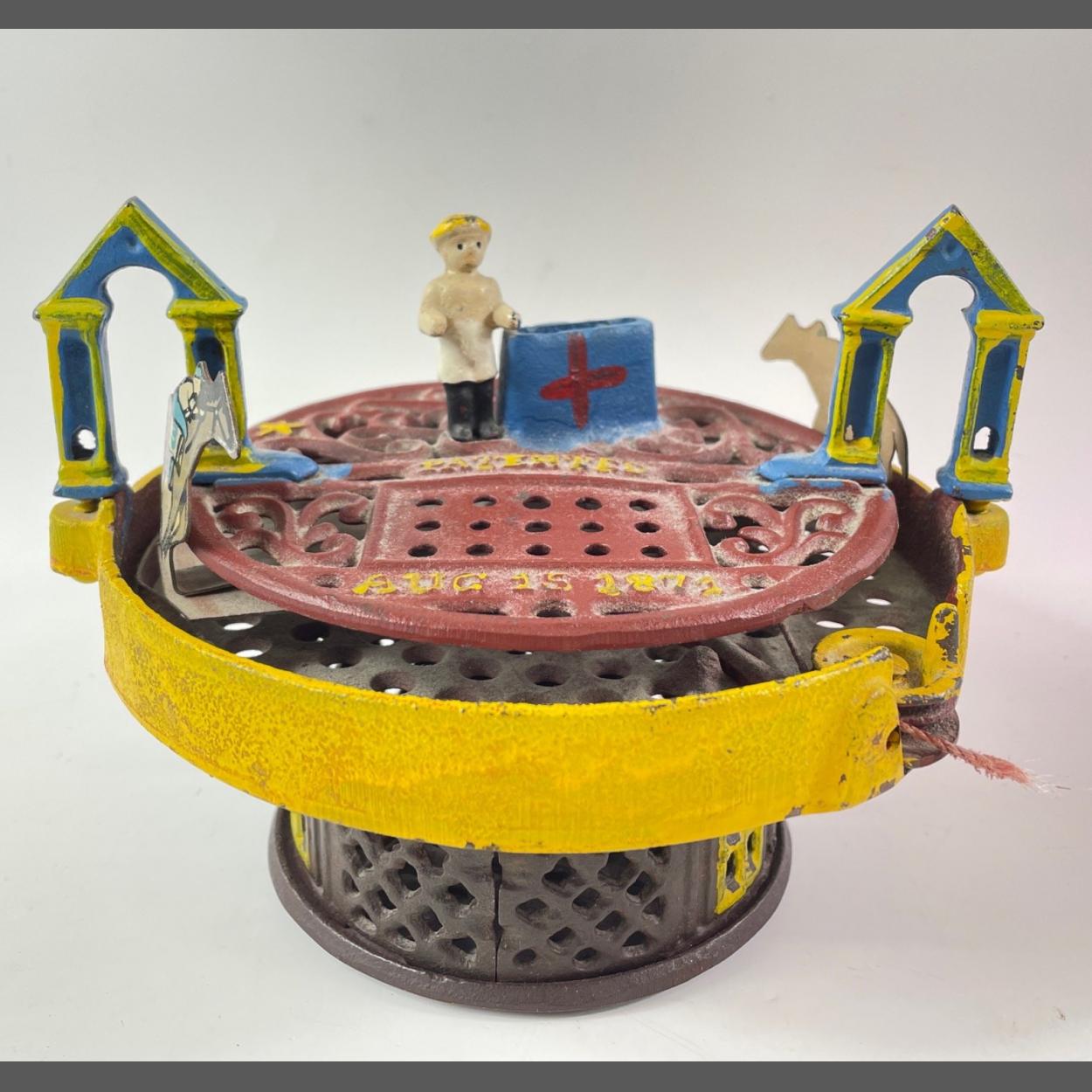 A vintage cast iron MECHANICAL MONEY BANK with horse racing to top, marked 'Patented Aug 15 1871'