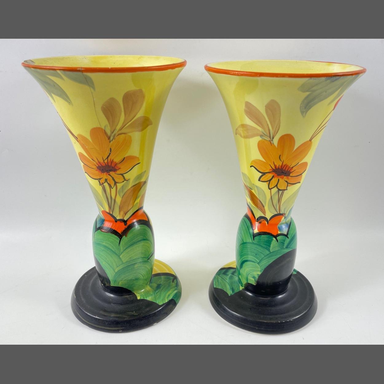Condition report: Damage and crack to base and top of one vase. The other in good condition.
