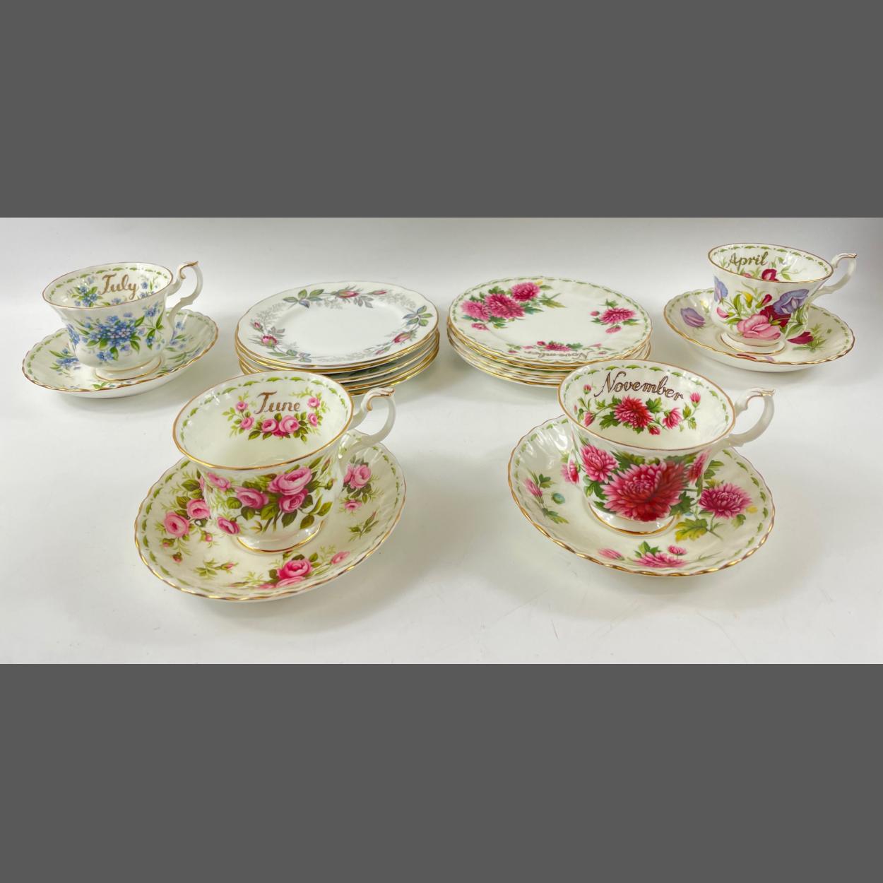 ROYAL ALBERT part Flowers of the Month Series, 4 tea plates saucers and cups of the months APRIL/JUNE/JULY and NOVEMBER also 6 Paragon tea plates.