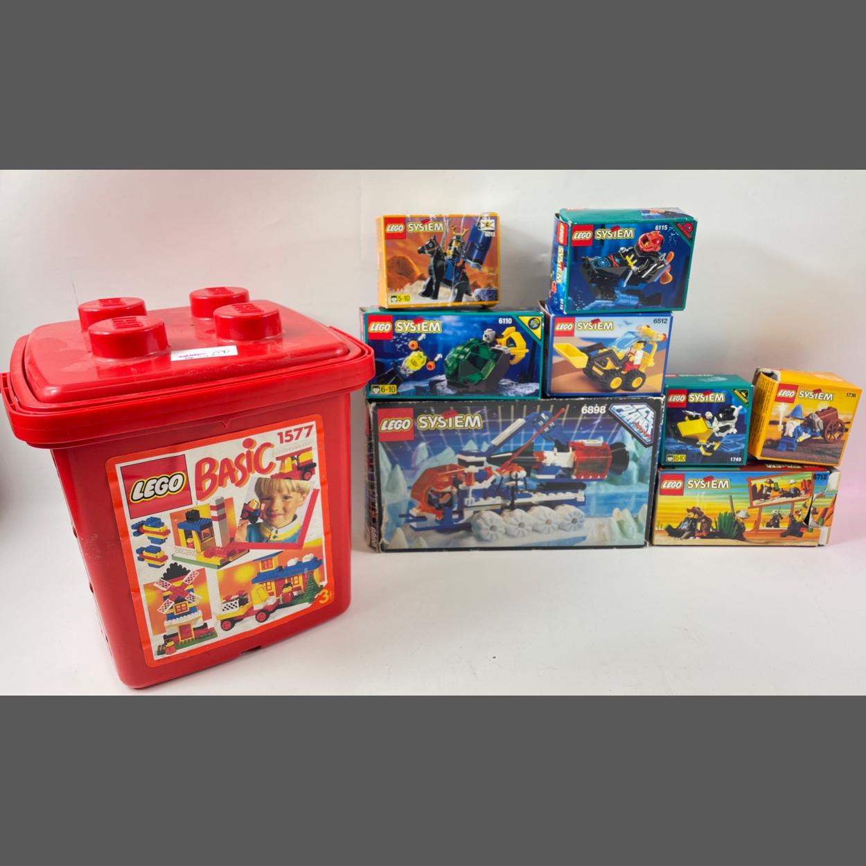 A mixed lot of LEGO to include a Space Ice Planet Ice Sat V (ref 6898), Wild West Cowboy Western Cowboys (ref 6712), a Landscape Loader (ref 6512), a Castle Knights Wizards Cart (ref 1736), a Samurai Swordsman Ninja (ref 6013), an Aquazone: Aquanauts Paravane (ref 174), a Aquazone Shark Scout (ref 6115), a Hydronauts Solo Sub (ref 6110). The above are all boxed and believed to be complete. Also unboxed, LEGO Town DERBY TROTTER (ref 6355), a LegoTown Stunt Copter With Octan Minifigure (ref 6515) (missing one sticker) plus a large tub of mixed Lego pieces owner confirms all pieces present
