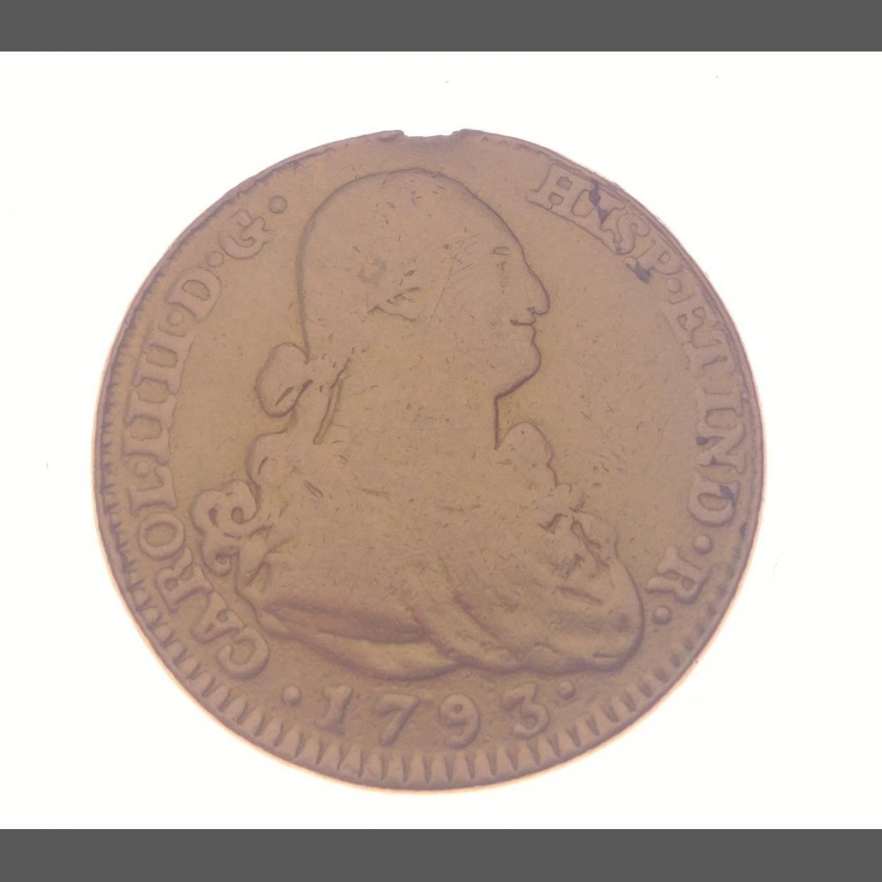 GOLD 2 Escudos Carolus IV Doubloon 2 Escudos dated 1793 - coin has a tiny chip out of the edge of the coin just above the King's Head - weight 6.635g