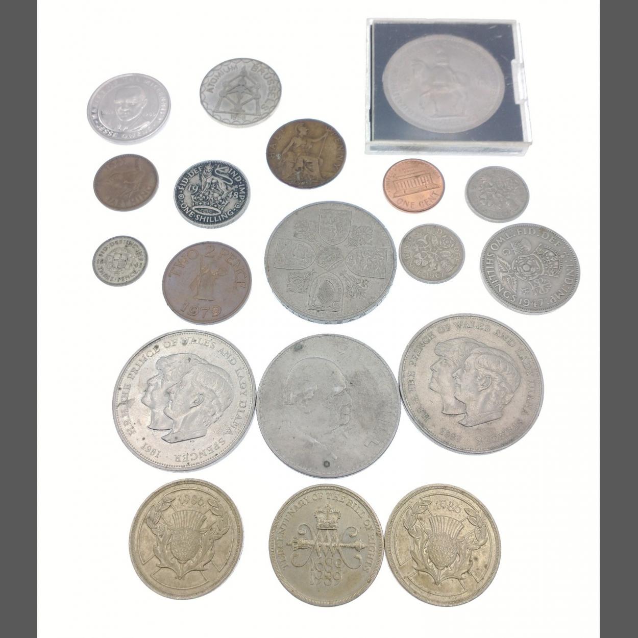 A collection of mixed British coinage to include commemorative Half Crowns, Diana and Charles1981commemorative coin, Five Shilling coins, a half penny, six pences, three two pound coins etc