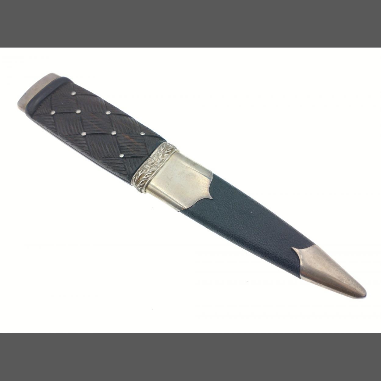 Silver Mounted Skean Dhu with inset Cairngorm stone. Hallmarks for Edinburgh 1992. Maker A.F.C. In excellent order with plain silver mounts to sheath and a rope weave effect on wood handle with studs.- 19.5cm length approx