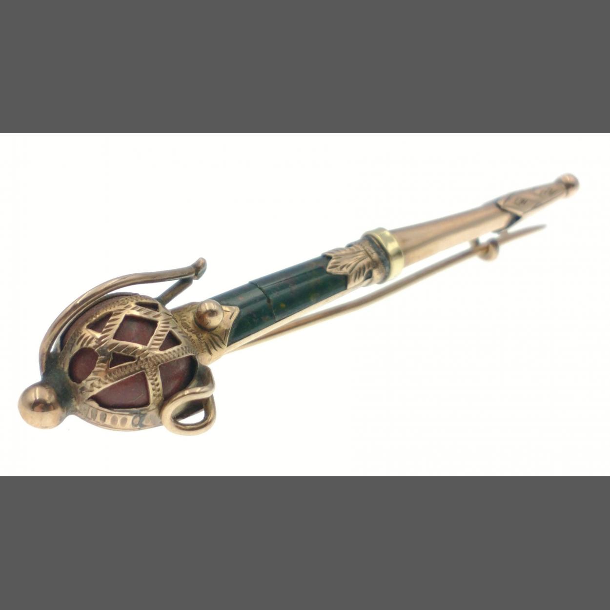 Cased Victorian Scottish Gold kilt pin. Just over 6cm with working pin. 4.6g in weight. Lovely bloodstone agate shaft No hall mark but previously tested to 15ct.