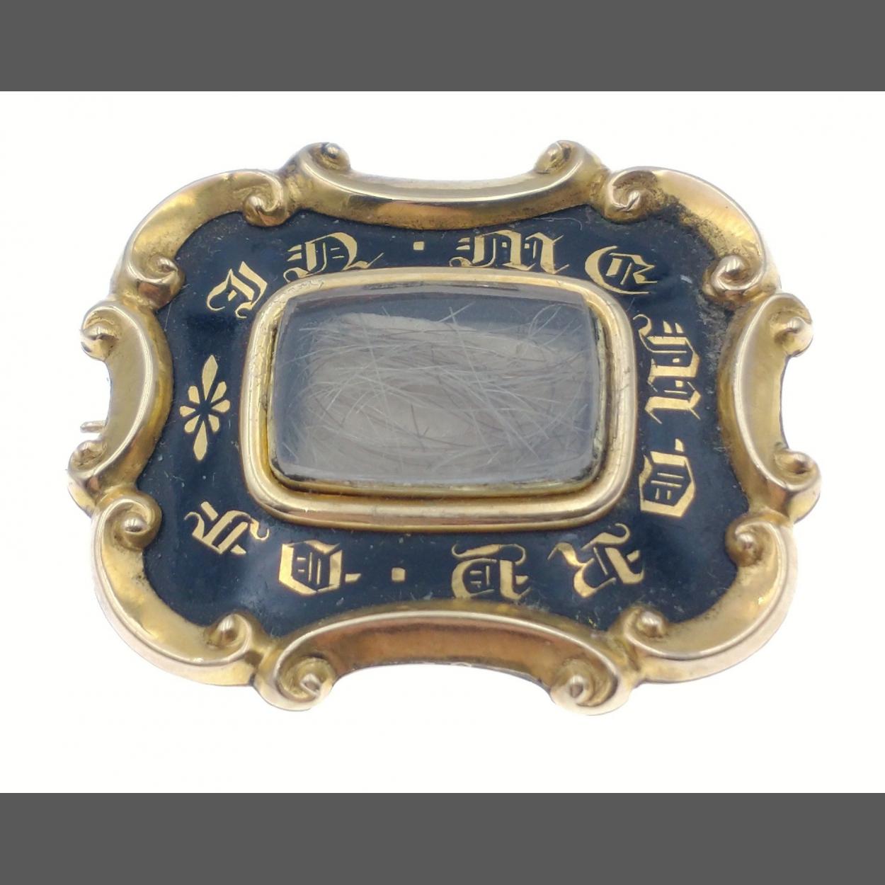 Gold Victorian Momento 'Yellow Metal' Mori brooch with lock of Hair. Named on back, David Evans 1841. Approx. 28mm, weighs 5.90g. Note that although the brooch is in excellent condition the pin is a much later replacement. No hallmarks but tests as gold rather than pinchbeck.
