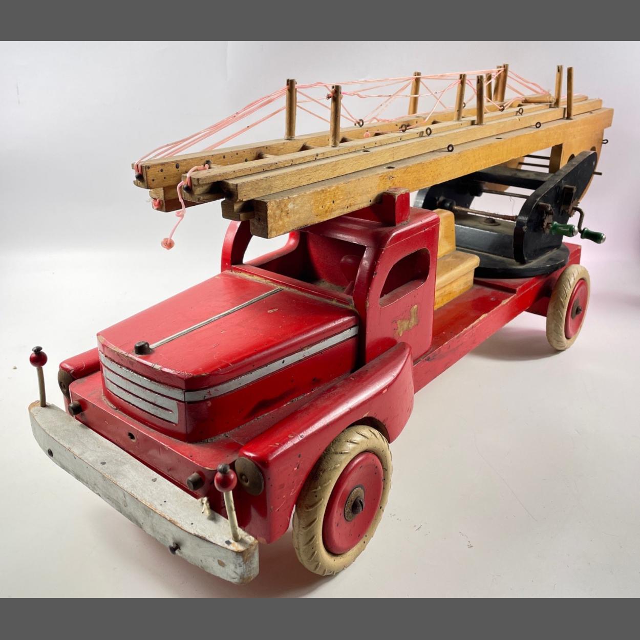 Rare and Substantial 1960s Swedish Brio wooden model fire engine. This is in excellent albeit slightly dusty condition, paint and graphics are excellent. All ladders are complete and slide up easily although they do need re strung to work correctly with the winder. This is the rare long hood American style model.